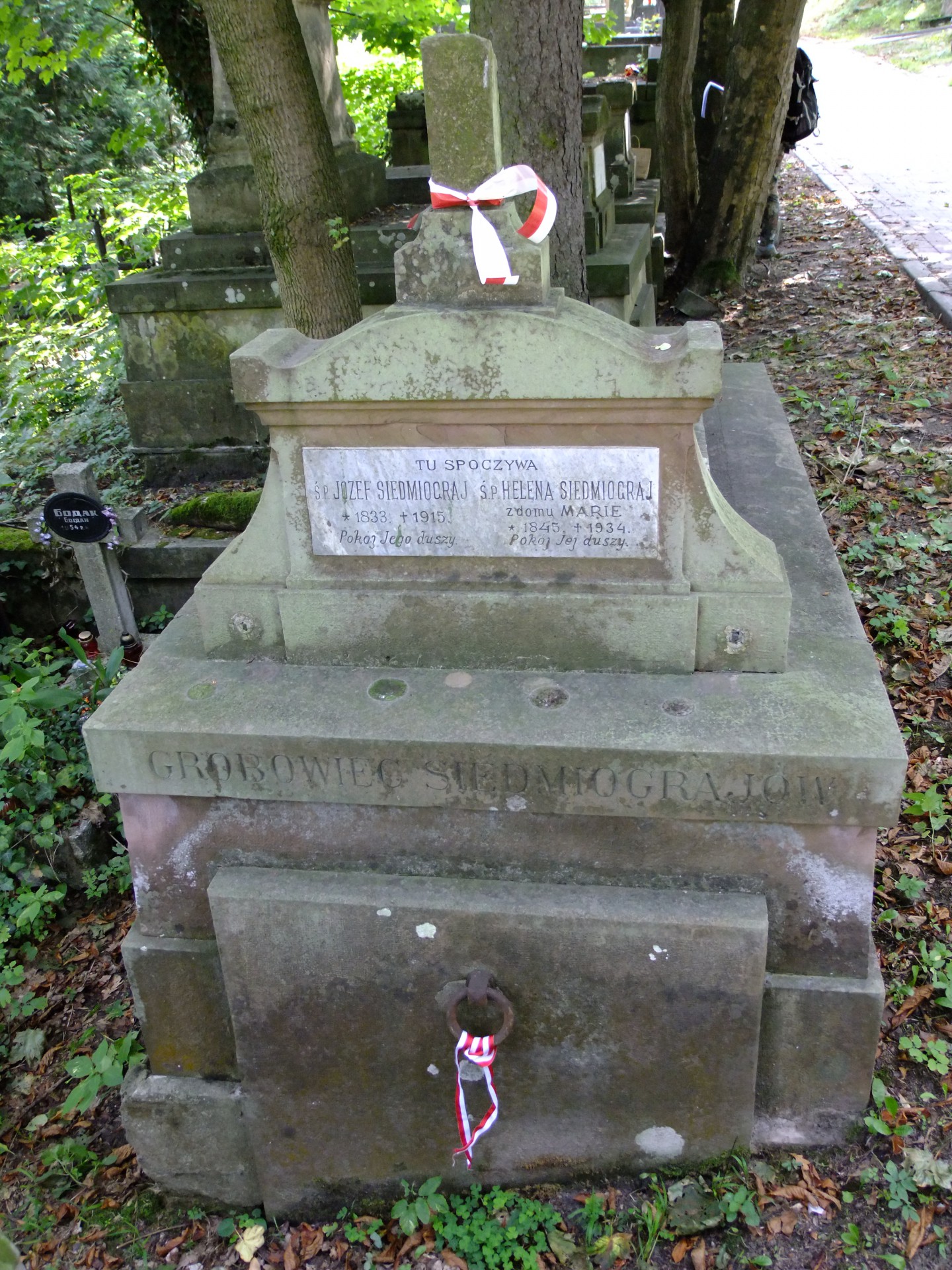 Czoło płyty przykrywającej grobowiec: GROBOWIEC SIEDMIOGRAJÓW// Tablica marmurowa: TU SPOCZYWA/ Ś.P. JÓZEF SIEDMIOGRAJ/ *1833. +1915./ POKÓJ JEGO DUSZY/ Ś.P. HELENA SIEDMIOGRAJ/ Z DOMU MARIE/ *1845. +1934./ POKÓJ JEJ DUSZY.//