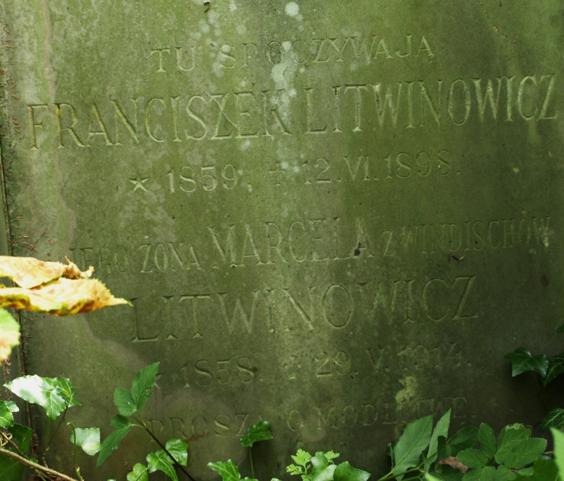 TU SPOCZYWAJĄ / FRANCISZEK LITWINOWICZ / * 1839. + 12.VI.1898 / I JEGO ŻONA MARCELA Z WINDISCHÓW / LITWINOWICZ / * 1858. + 29.V.1914. / PROSZĄ O MODLITWĘ.